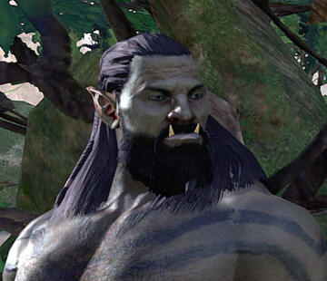 Not the tallest of Orsimer but above-average in height, he stands a head taller than many of his people. Tempered by years of labor at the forge, Garmokh sports an imposing, beefy build, his body thick with densely packed muscle. Characterized by a well-developed chest and sloping back, broad shoulders and bulging arms, his upper body sits atop a pair of powerfully carved legs, adjoined by a prominent rump. His deep emerald skin is covered with a thick dusting of coarse dark hair nearly everywhere, particularly evident across his chest, forearms, back and legs. Dimly painted sigils and tattooed runes lovingly decorate his body, a series of defensive wards and spellcasting conduits. His raven-dark hair is typically tied up high in a tail or bun with some draped down to his shoulders, though he occasionally cuts down the sides and sets the rest up in a messy hawk or shaves his scalp down entirely. His thick jaw is beset with an obsidian beard, glossy and a touch tousled, kept at a short length past his chin. A pair of light bluish-gray eyes underlie his thick but manicured brow, barely visible cheekbones poised at an angle above either outer side of the short tusks jutting just past his puffy lips. He is often seen sporting piercings in his ears, nose and nipples, simple iron rings, and decorates his tusks with more flashy jewelry if attending a more upscale event. His garb usually consists of simple, plain tailored textiles, a tunic, trousers and boots. When working the forge or in sparring scenarios, he opts for a bare or barely covered chest, heavy gloves and plated boots with thick leather breeches. When battling, he employs all manner of arms, though is most proficient with a blade in either hand, aided by complex enchantments.